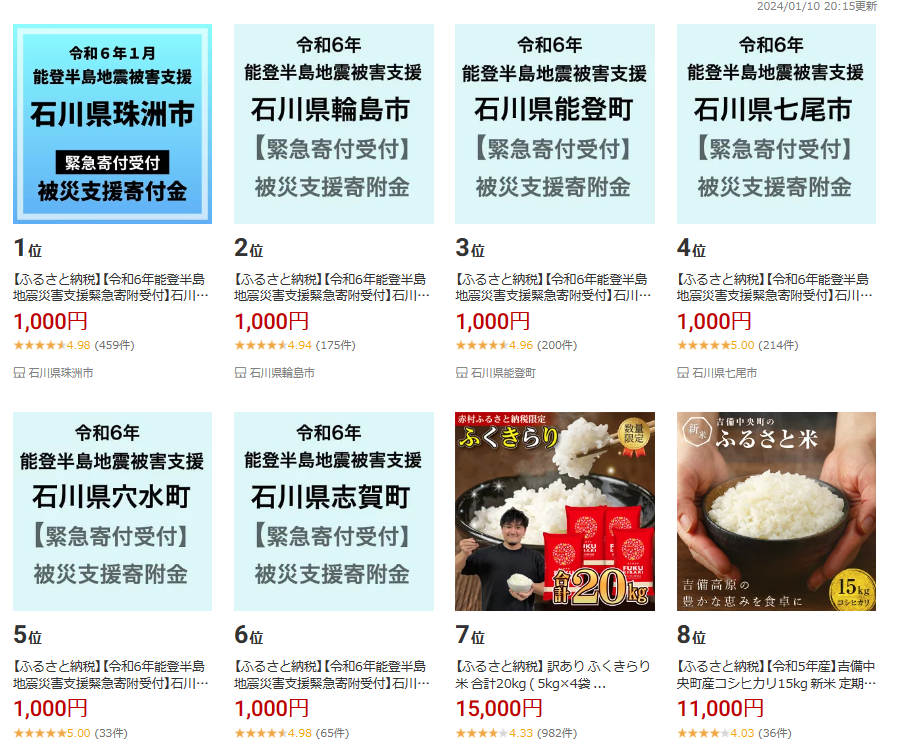 2024年1月10日現在でふるさと納税ランキング1位に上がったのは、石川県珠洲市への支援金です。