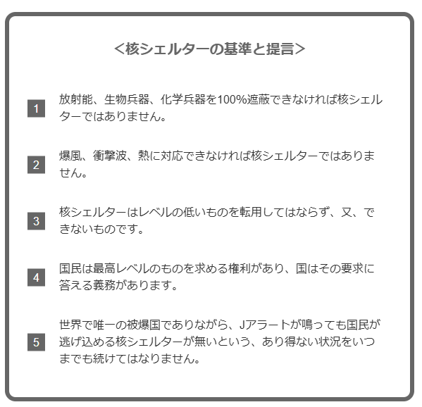 核シェルターに関する基準と提言を見つけたが、日本にこの基準に沿った核シェルターの普及率を上げる政策は耳にする機会がない。