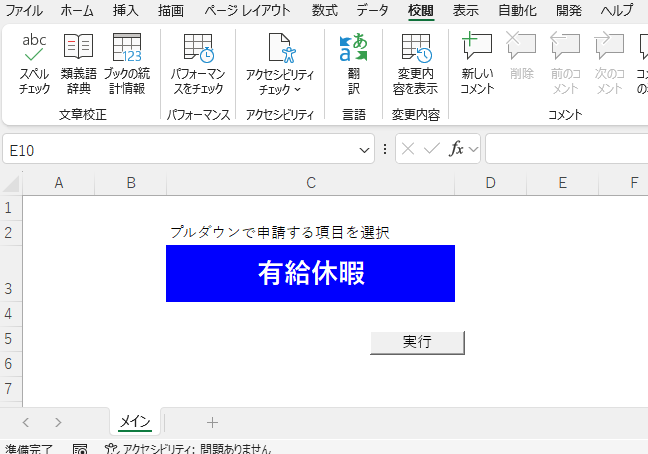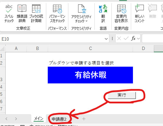 メインのシート C3のセルで申請の種類を選択し、実行ボタンを押す